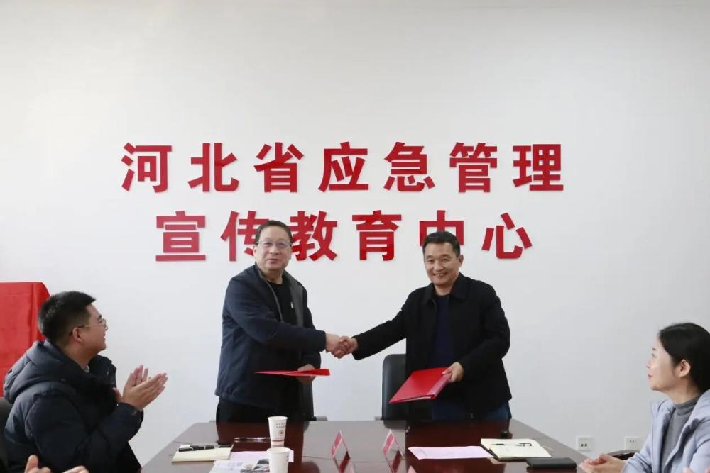 在与会人员的共同见证下,河北传媒学院产教中心主任杨子文与河北省应急管理宣教中心副主任何建立分别代表双方在合作协议上签字,并交换协议文本。随后,河北传媒学院副校长李建平与河北省应急管理宣教中心主任宁建立共同为“产教融合实习实训基地”揭牌。